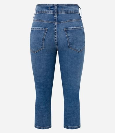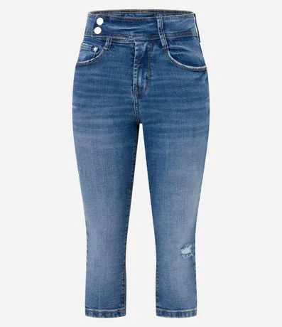 Ref: Calça capri, confeccionada em jeans, cós com botões no fechamento lateral e puído na perna.