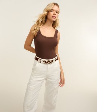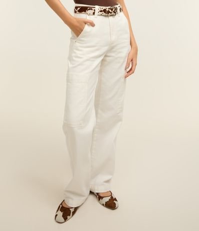Calça feminina no modelo cargo, cintura alta com passantes, fechamento tradicional, bolsos laterais e traseiros. Peça em material mais sustentável.