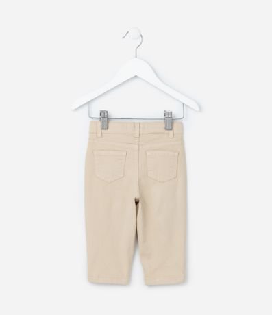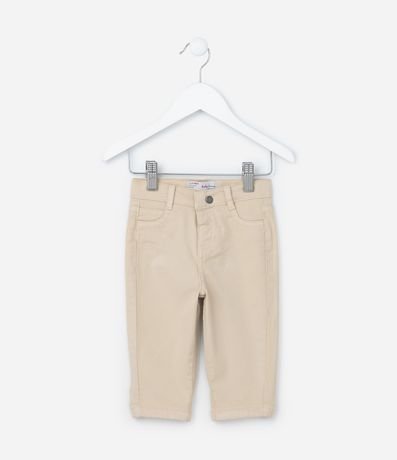 Calça infantil para bebês, de modelo casual, confeccionada em sarja, com passantes no cós e bolsinhos. Possui fechamento frontais tradicional.
