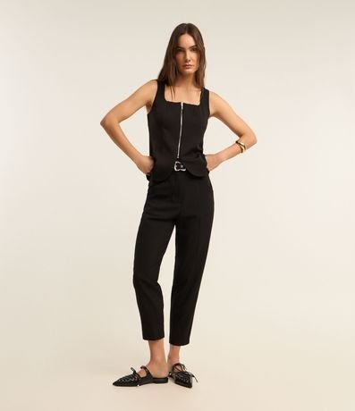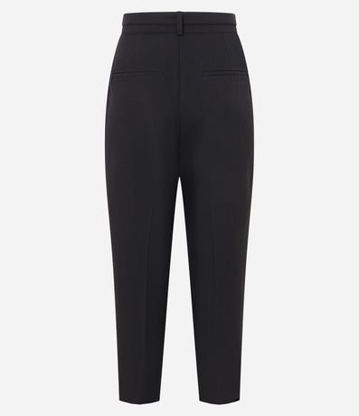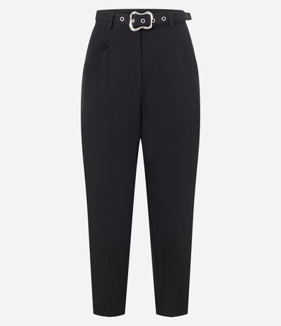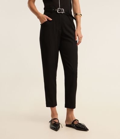 Ref: Calça cenoura de corte alfaiatado e cintura alta, com passantes na cintura, bolsos frontais e recortes detrás que remetem ao aspecto de bolsos. Inclui cinto com ilhoses e fivela metalizada com efeito martelado.
