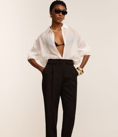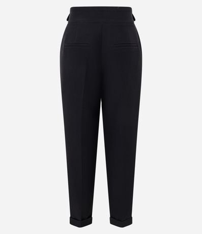 Ref: Calça cenoura em alfaiataria com barra italiana, cós simples e detalhe de lapela.