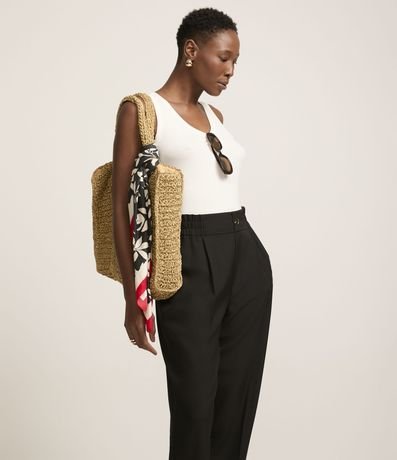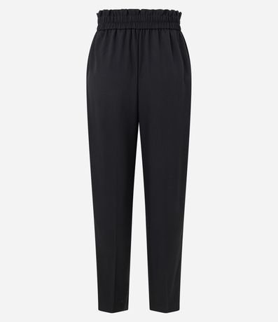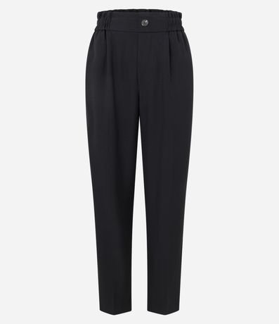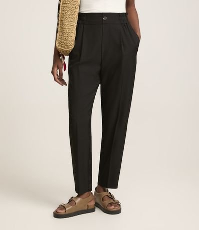 Ref: Calça cenoura alfaiatada feminina, confeccionada em poliéster, com abotoamento frontal, cós elástico e pregas.