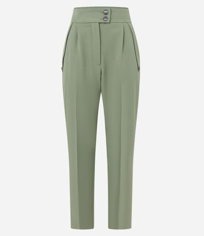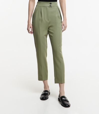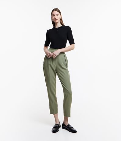 Ref: Calça cenoura alfaiatada, com fechamento em botão no cós, pregas e superfície sem estampa.