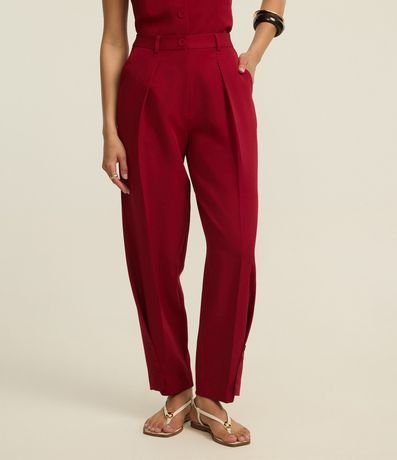 Calça alfaiatada modelo cenoura com bolsos, pregas e detalhe de botões na barra.