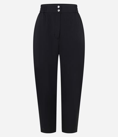 Calça cenoura alfaiatada, confeccionada em crepe, com cintura alta, elásticos nas laterais do cós, botões duplos, fechamento tradicional e bolsos falsos atrás.