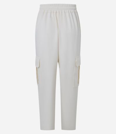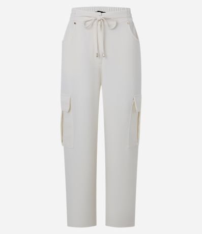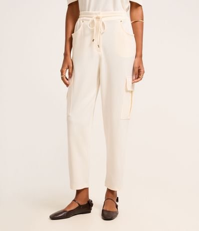 Ref: Calça cenoura de cintura alta, confeccionada em crepe, com elástico na parte detrás do cós e amarração na região frontal. A peça possui detalhes metalizados próximos dos bolsos frontais e na amarração. Conta com bolsos cargos laterais.