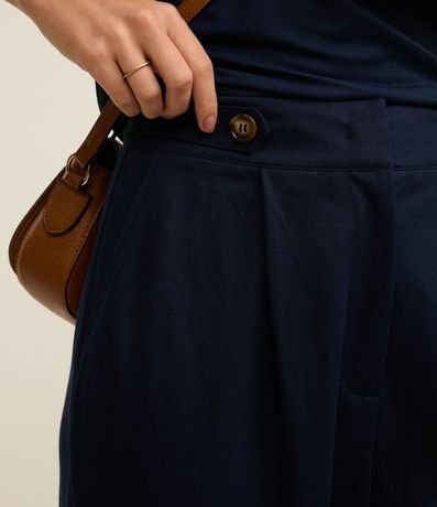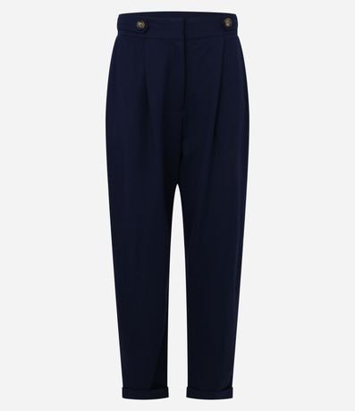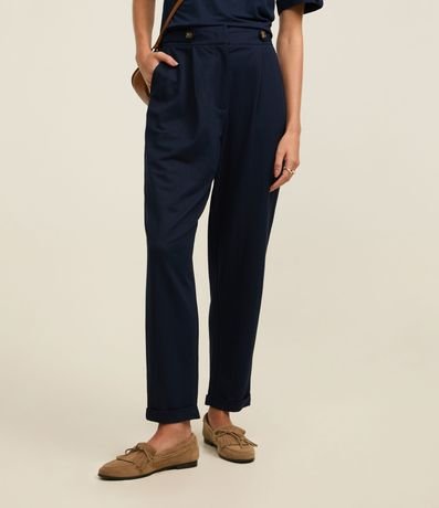 Calça cenoura de cintura alta, confeccionada em piquet com viscose mais sustentável, com fechamento tradicional. Peça conta com faixas na cintura com botões, pregas e barras dobradas. Tecido com efeito sarjado.