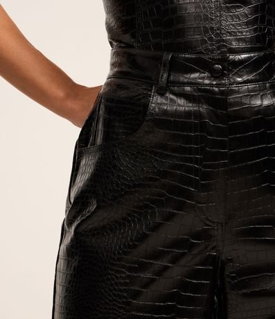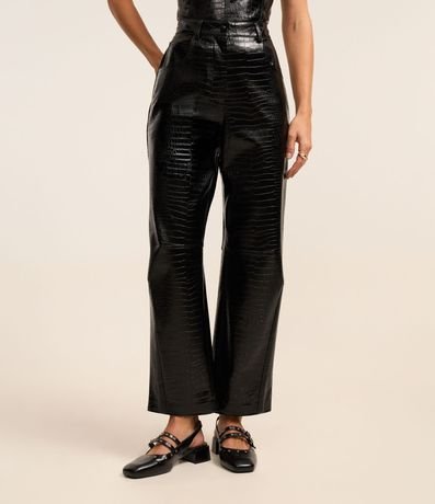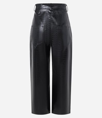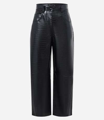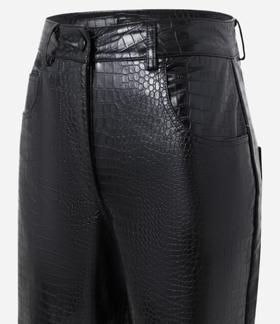 Ref: Calça cenoura de cintura alta, confeccionada em material sintético, com passantes na cintura, fechamento tradicional e bolsos. A peça conta com textura croco. Esta roupa é incorporada na tendência western.