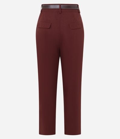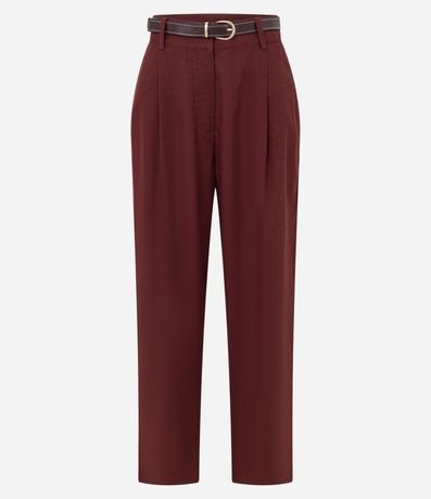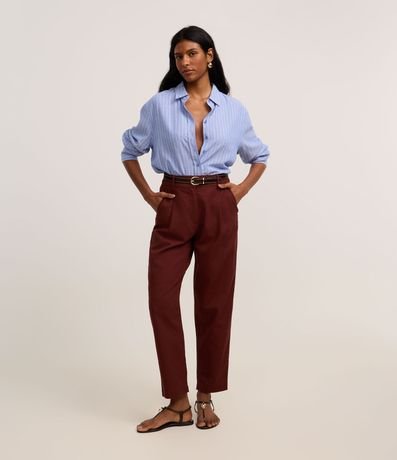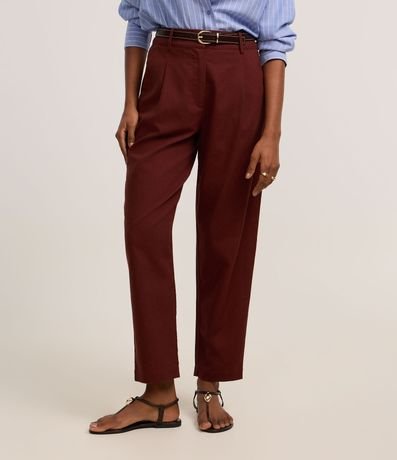 Ref: Calça cenoura de cintura alta, confeccionada em viscolinho, com passantes no cós, pregas e lapelas atrás que parecem bolsos. Inclui cinto fino afivelado confeccionado em PU. Este produto possui viscose certificada em sua composição, sendo ambientalmente mais responsável.
