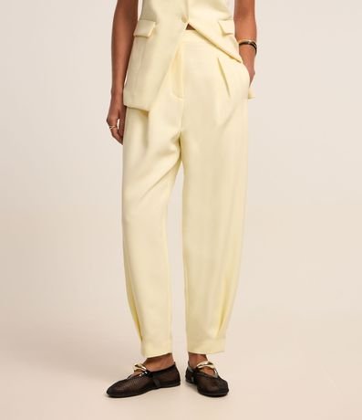 Calça cenoura feminina de alfaiataria com pregas na parte frontal e na barra.