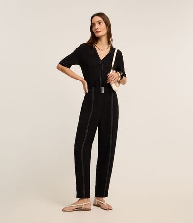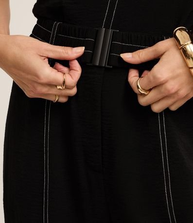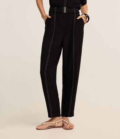 Ref: Calça feminina de modelo cenoura, confeccionada em crepe airflow, com cintura alta e sem estampa. Possui bolsos, detalhe de costuras contrastantes e cinto de elástico com fivela de metal.