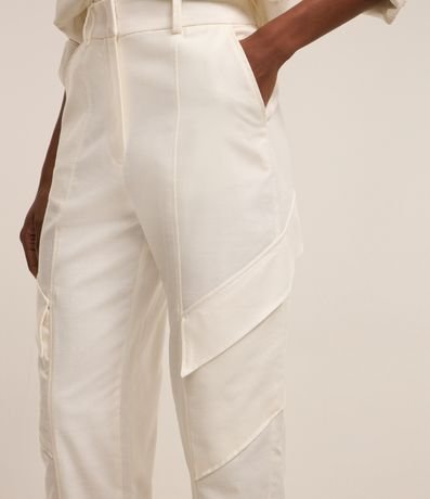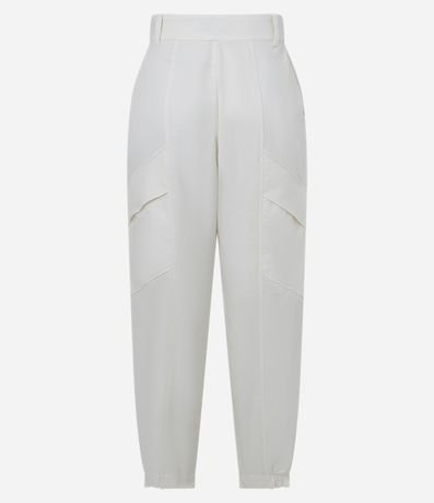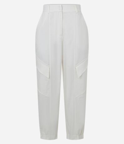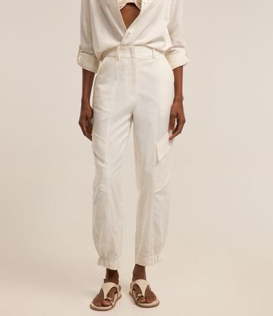Ref: Calça cenoura, confeccionada em sarja, bolsos cargo diagonal e franzidinho na barra.