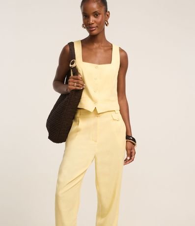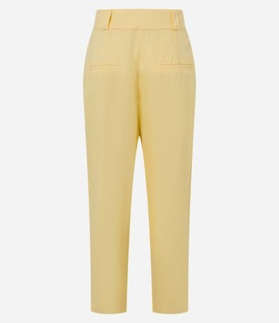 Ref: Calça cenoura de cintura alta, confeccionada viscolinho com 15% de linho, com passantes no cós, lapelas com botão abaixo do do cós, pregas e fechamento tradicional. Este produto possui viscose certificada em sua composição, sendo ambientalmente mais responsável.