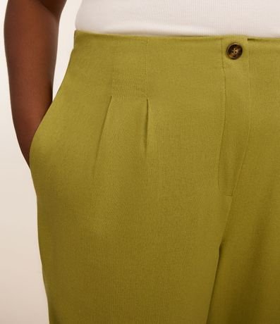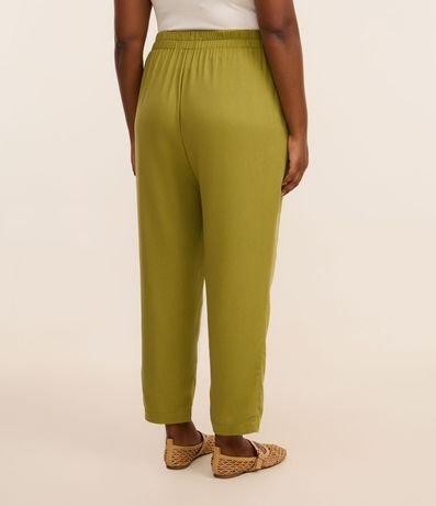 Ref: Calça feminina confeccionada em viscolinho. Peça no modelo cenoura, cós com elástico nas costas, fechamento tradicional, bolsos laterais e pregas frontais.