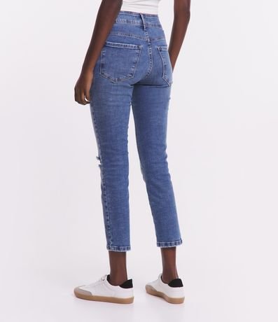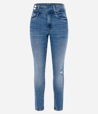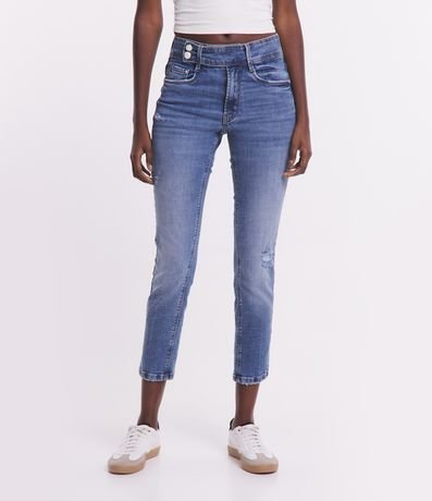 Calça feminina cigarrete confeccionada em jeans, com cós transpassado com 2 botões e puídos.