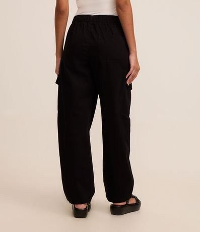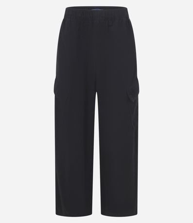 Ref: Calça feminina confeccionada em sarja mais sustentável com boas práticas ambientais, peça no modelo cropped barrel com bolsos cargo, cós com elástico e cintura baixa.