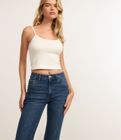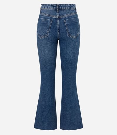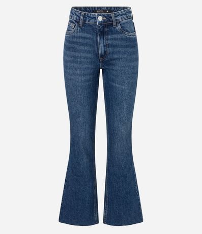 Calça feminina confeccionada em jeans, de modelo flare cropped, com bolsos e detalhes na lavagem manchadinhas.
