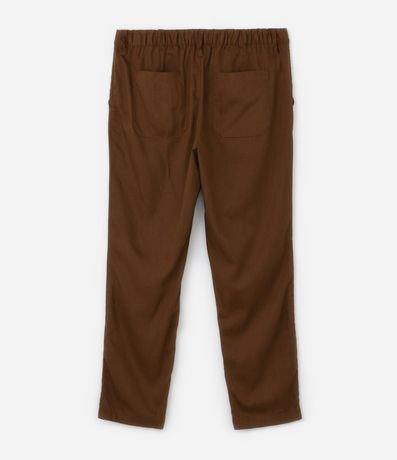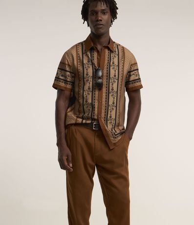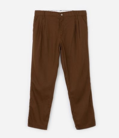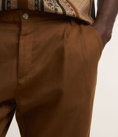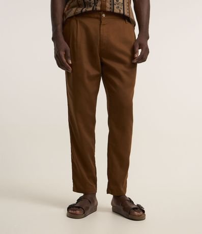 Ref: Calça masculina confeccionada em material mais sustentável, em alfaiataria com cós com passantes, fechamento tradicional, bolso, pregas e textura.