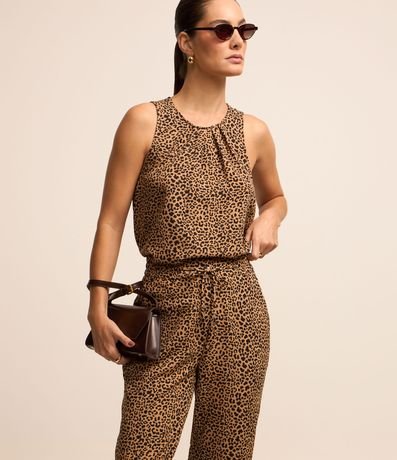Calça fluida em crepe, com amarração no cós e estampa animal print onça.