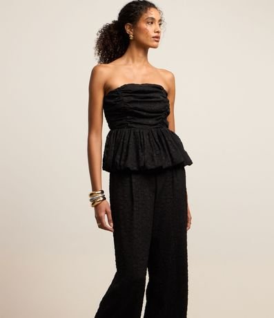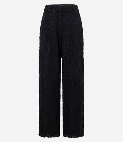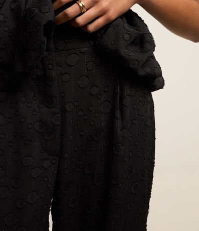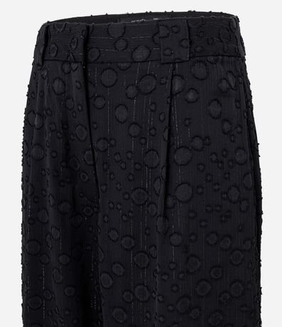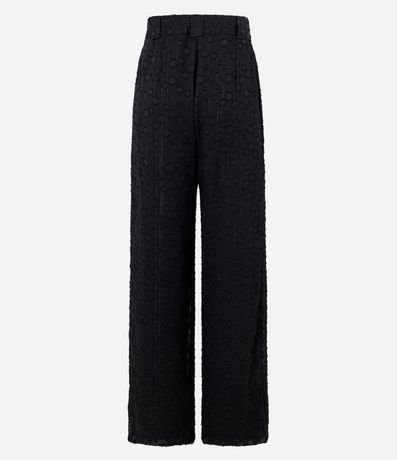 Ref: Calça confeccionada em tecido jacquard com fechamento tradicional com passantes na cintura, pregas além de textura diferenciada com formatos de círculos. Possui fios metalizados.