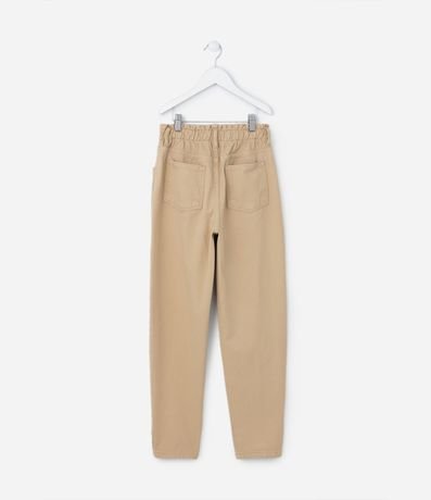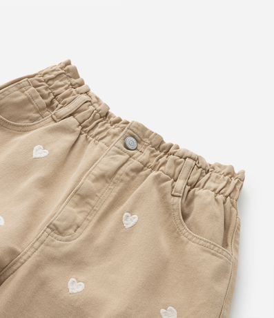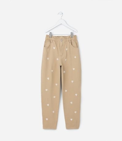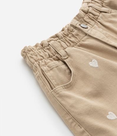 Ref: Calça confeccionada em sarja, cós elástico com botão e zíper, bolsos frente e costas com bordadinhos de corações.