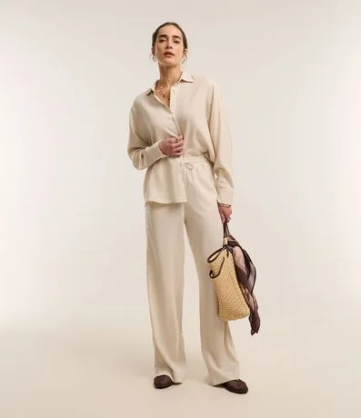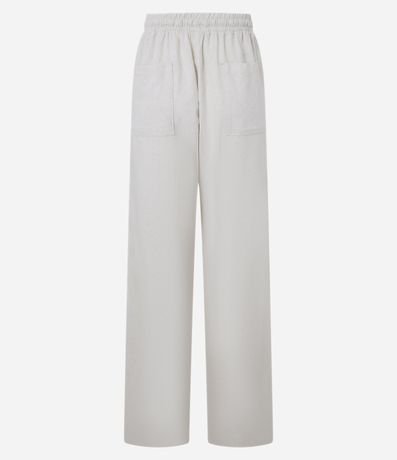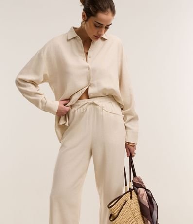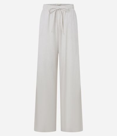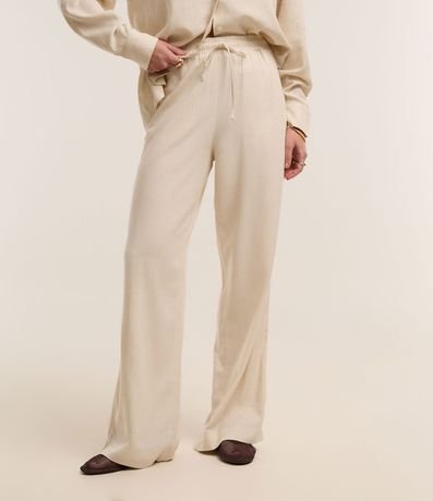 Ref: Calça fluída feminina, confeccionada em viscose e linho, com amarração no cós e superfície sem estampa.