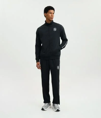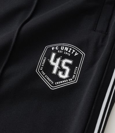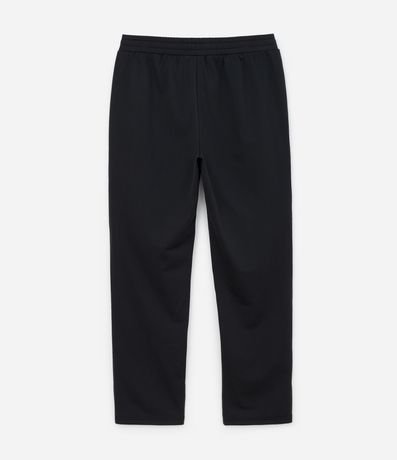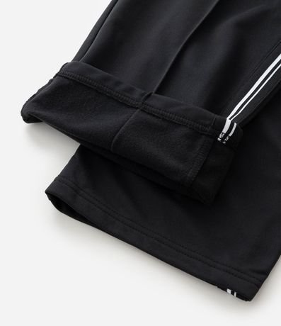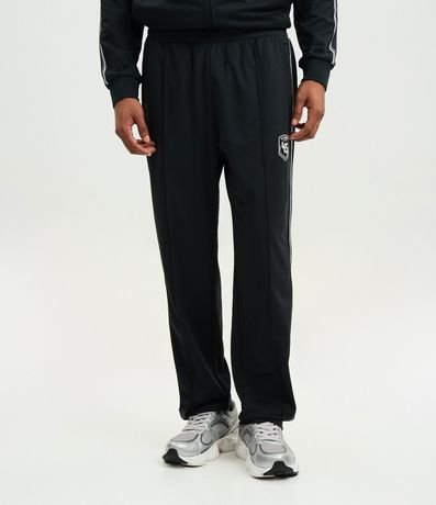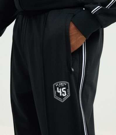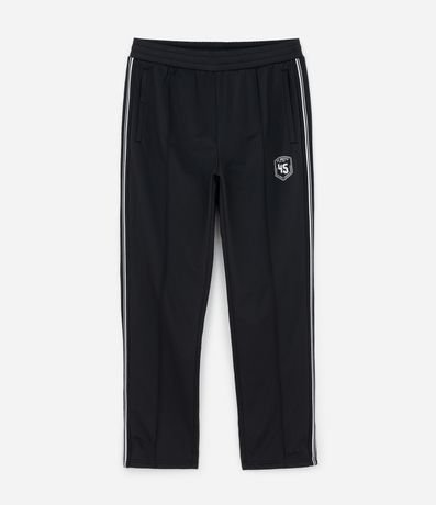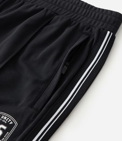 Ref: Calça masculina esportiva em helanca com listras contrastantes nas laterais e estampa localizada na parte frontal, trazendo estilo casual e esportivo. Possui cós elástico com cordão para ajuste e bolsos funcionais.