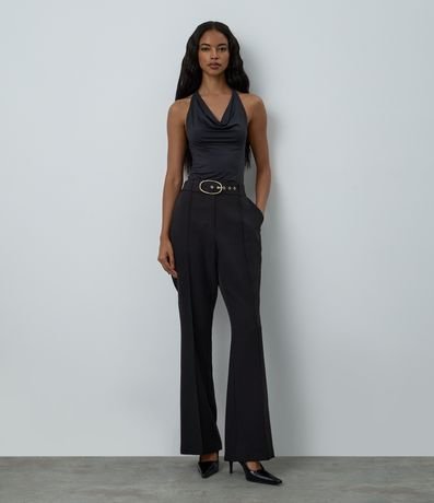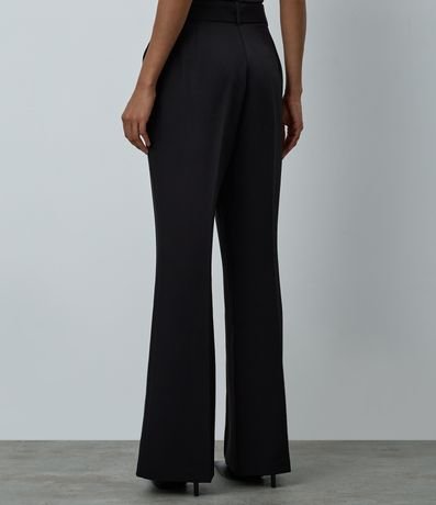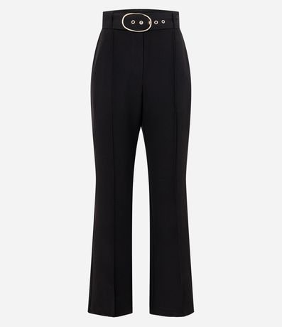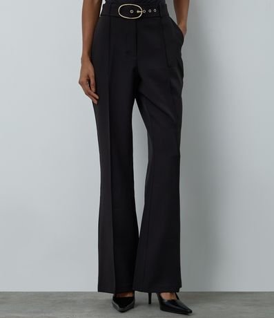Calça flare em corte alfaiatado, possui cinto com fivela oval e pregas na parte da frente.