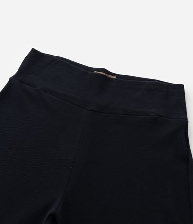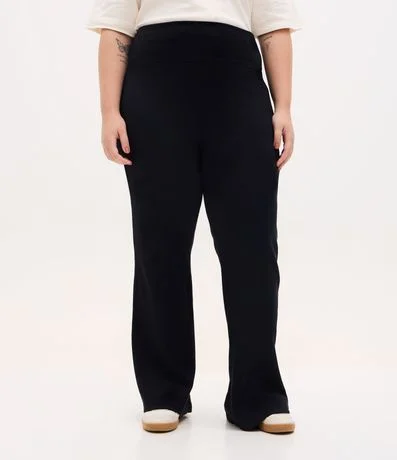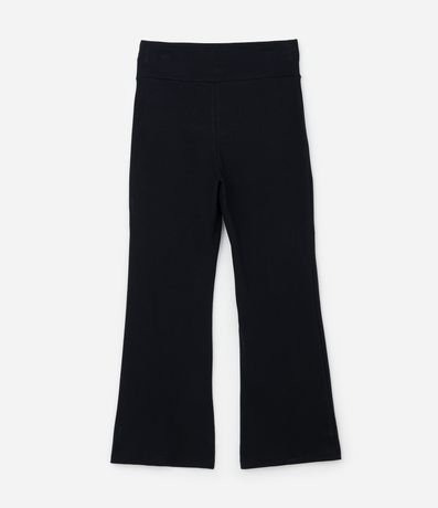 Calça feminina confeccionada em malha ribana de algodão, com cós alto e de modelo flare.
