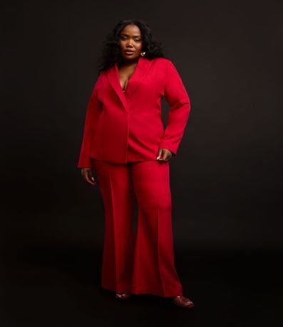 Ref: Calça feminina Curve & Plus Size em alfaiataria no modelo flare com cós passante, fechamento tradicional invisível, elástico traseiro, bolsos e friso frontal. Peça em colaboração com a modelo Rita Carreira.