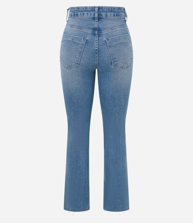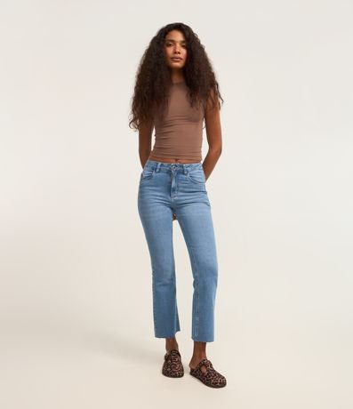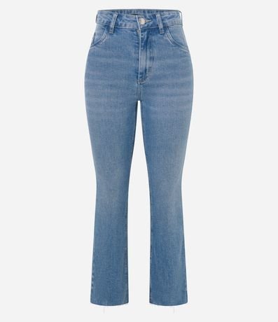 Ref: Calça feminina confeccionada em jeans, de modelo flare cropped, com passantes no cós e bolsos. Possui fechamento frontal tradicional com botão e zíper, e barra levemente desfiada com corte a fio. Este produto passou por um processo de confecção mais sustentável, adotando boas práticas ambientais e também material responsável em sua composição.