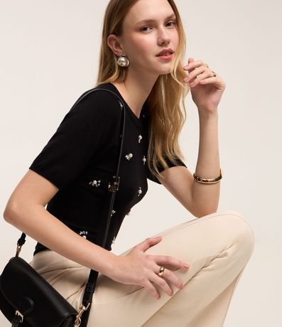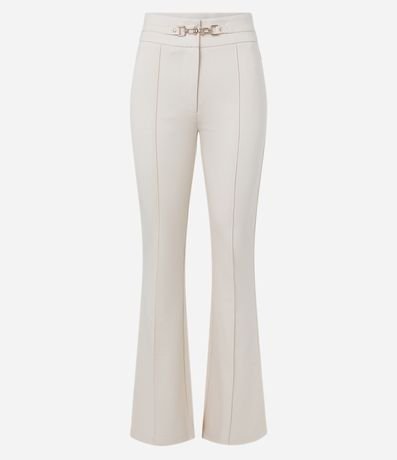 Ref: Calça flare feminina, confeccionada em ponto roma, com detalhe em metal no cós e fechamento frontal.