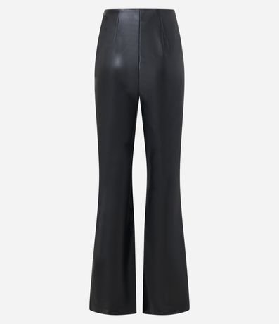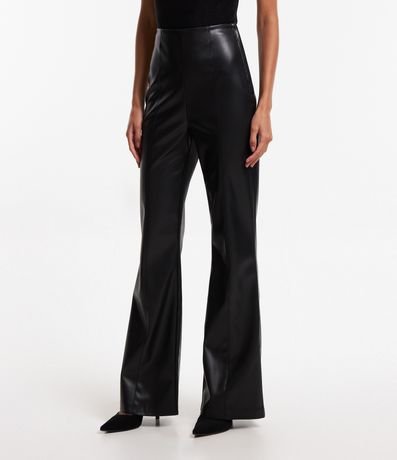 Calça flare, confeccionada em material sintético, pu, friso frontal e fechamento por zíper tratorado.