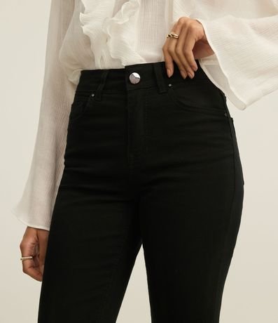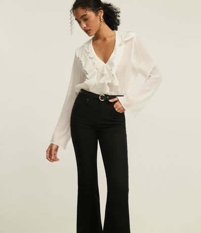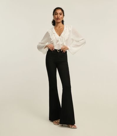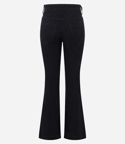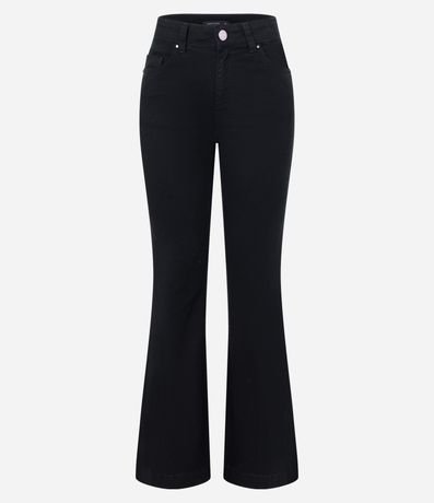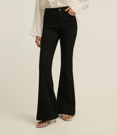 Calça flare com cintura alta, confeccionada em sarja com baixo consumo de água e bolsos frente e costas.