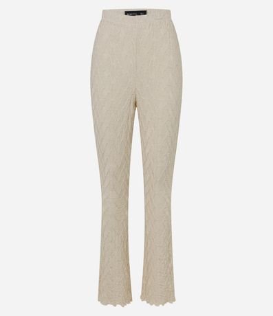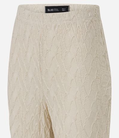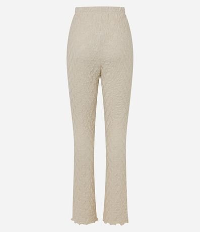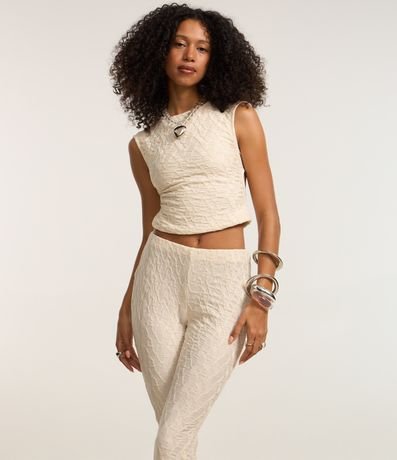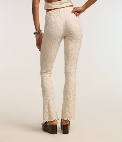 Ref: Calça de modelo flare, texturizada, com cós elástico e frufru na barra.
