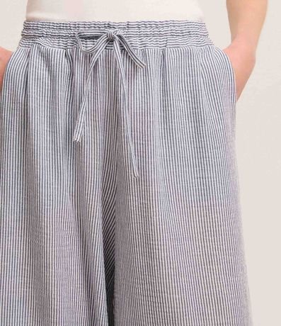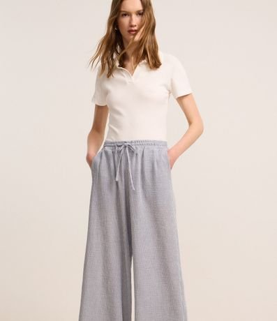 Calça feminina alfaiatada no modelo fluída, com cós elástico, cordinha, listras, bolsos e textura.