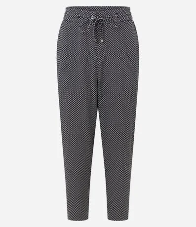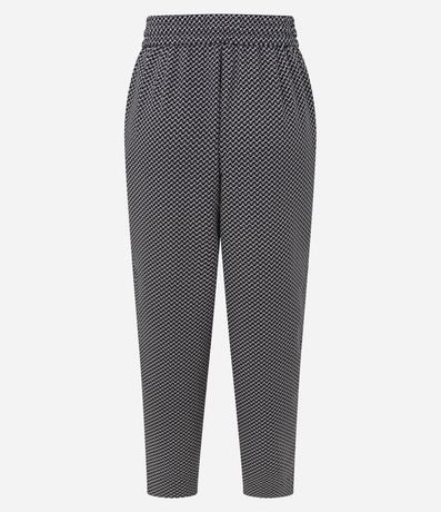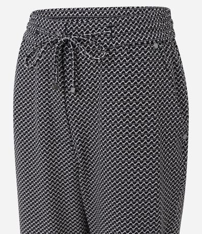 Calça fluída confeccionada em crepe com poliéster cerificado, cós elástico com cordão e estampa Pied-de-poule.