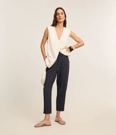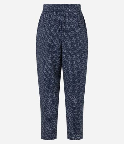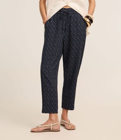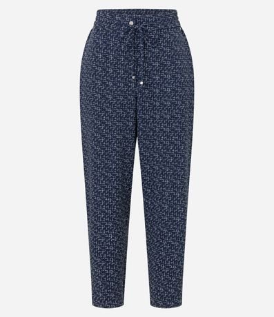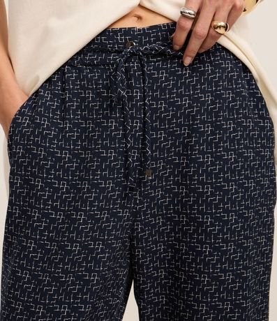 Ref: Calça fluida de cintura alta, confeccionada em crepe, com amarração com aviamentos metalizados, fechamento tradicional e estamparia com formas geométricas. Este produto possui poliéster certificado em sua composição, sendo ambientalmente mais responsável.