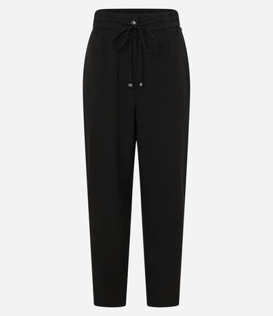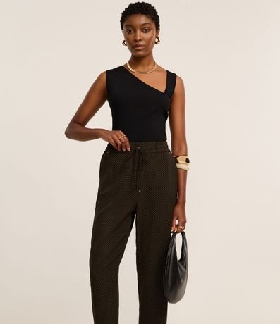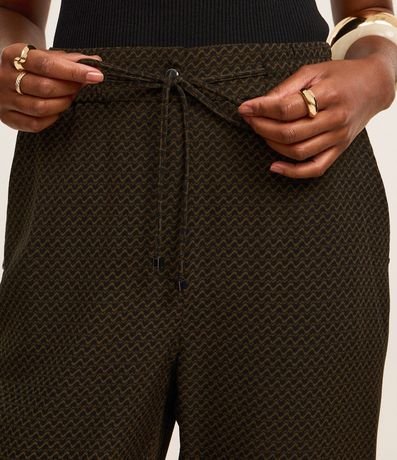 Calça fluida de cintura alta, confeccionada em crepe, com elástico e amarração com ponteiras no cós. A peça tem estampa geométrica com linhas curvas horizontais. Este produto possui material mais sustentável em sua composição, sendo ambientalmente mais responsável.