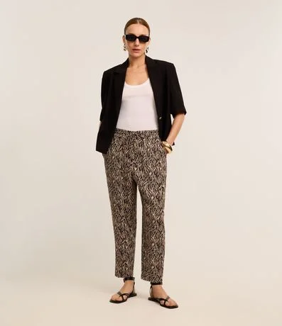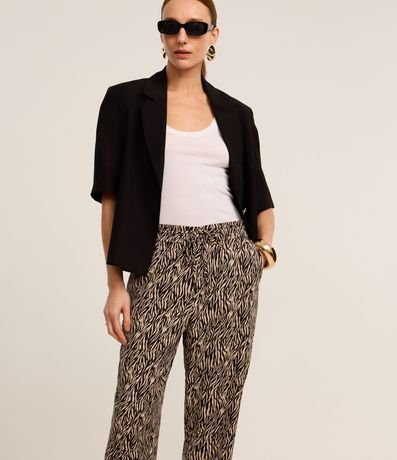 Ref: Calça feminina de modelo pijama, com corte fluído, cós elástico e amarração. A peça é confeccionada em crepe, possui bolsos e conta com estampa animal print de zebra.