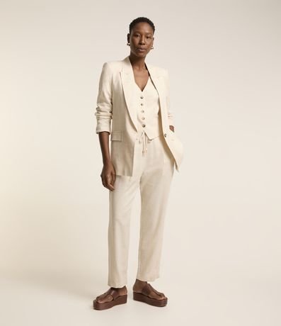 Calça feminina de modelo fluido, confeccionada em viscolinho, com cós elástico e amarração na cintura. Possui padronagem liso mescla, com pregas e bolsos.
