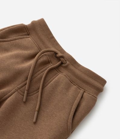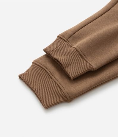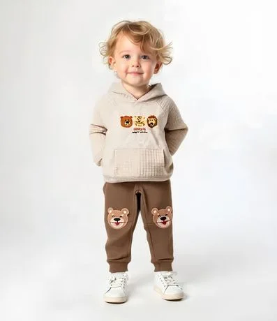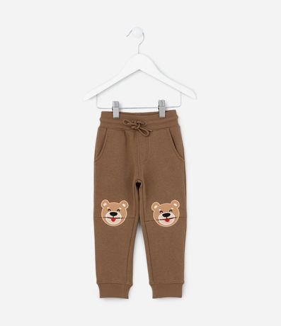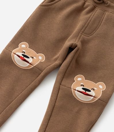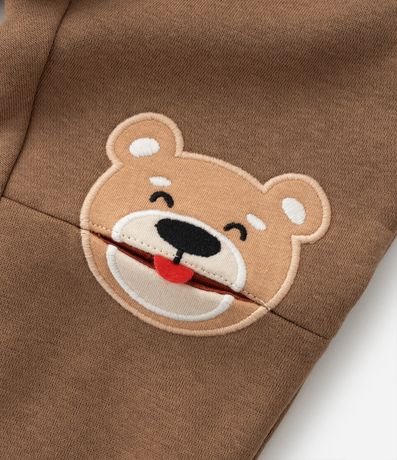Calça infantil confeccionada em moletom quentinho, com cós regulável, bolsos e estampa interativa de ursinho, nos joelhos.