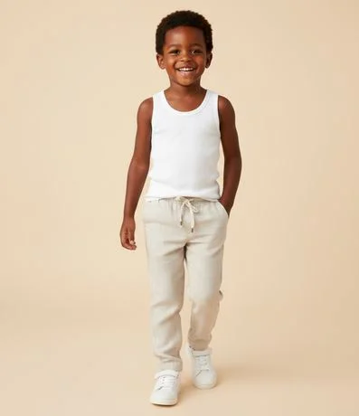 Ref: Calça infantil confeccionada com algodão certificado e linho -- materias primas naturais e fresquinhas. A calça tem cintura elástica com amarração, bolsos e recorte frontal.