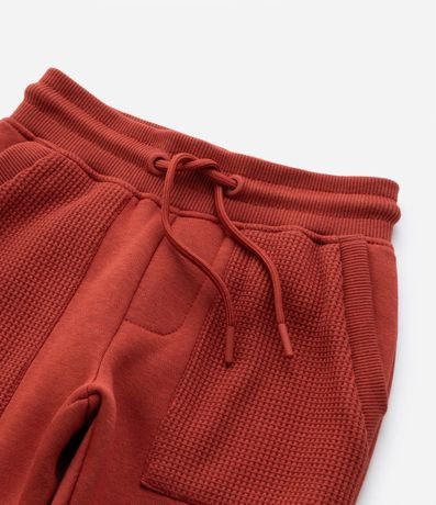 Calça infantil em moletom quentinho com cós regulável, bolsos, recortes e texturas.