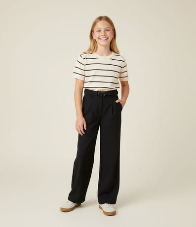 Ref: Calça infantil confeccionada em tecido plano de alfaiataria com estrutura firme e visual alinhado. Possui modelagem reta, fechamento frontal por zíper e botão, pregas frontais que valorizam o caimento e cinto unilateral aplicado, detalhe que adiciona estilo contemporâneo ao look.