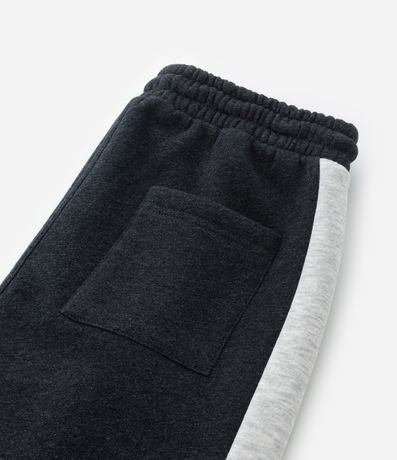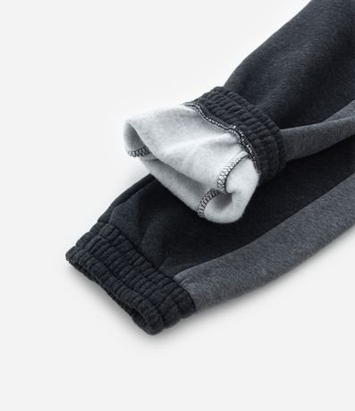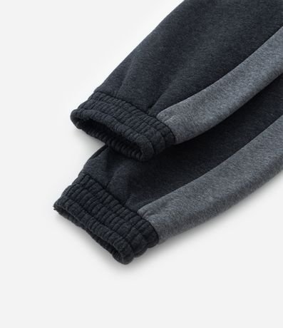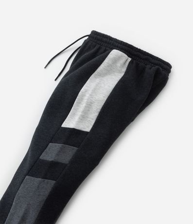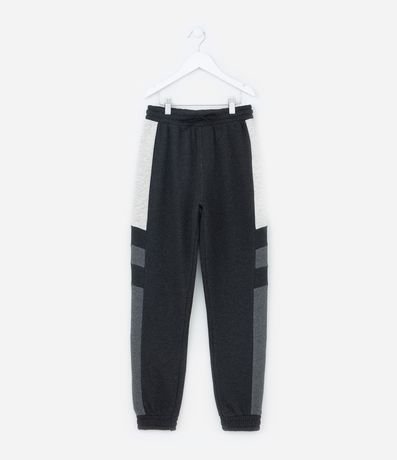Ref: Calça infantil confeccionada em moletom com cós elástico, cordinha para ajuste, bolso e recortes na lateral com bloco de cores.