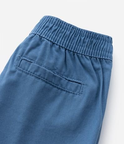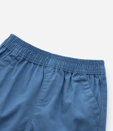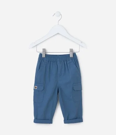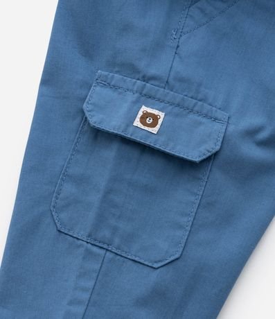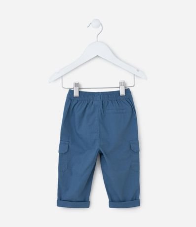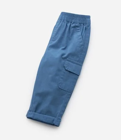 Ref: Calça infantil confeccionada em sarja, feita a partir de algodão mais sustentável, com cós elástico, bolsos cargo laterais com lapela e barra dobradinha.