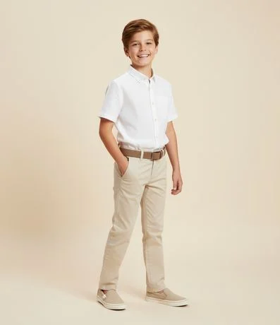 Ref: Cala infantil confeccionada em sarja, com passantes no cós, bolsinhos frontais e traseiros. Acompanha cinto com textura.