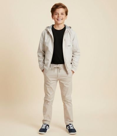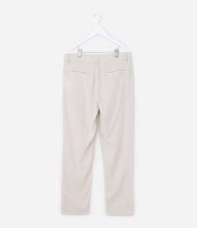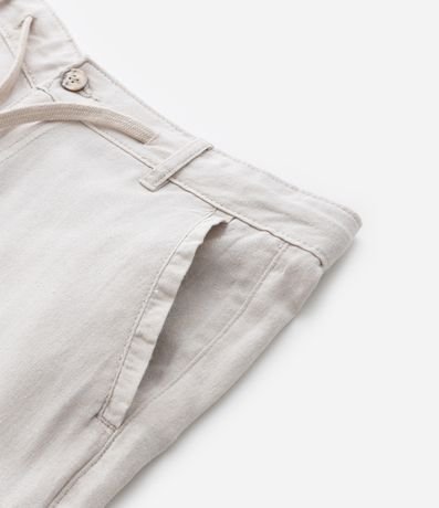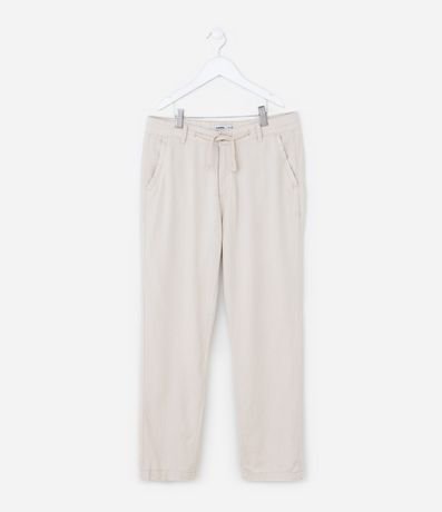 Calça infantil confeccionada em linho e viscose, sendo a viscose feita a partir de material mais sustentável. Possui cós com ajuste interno, passantes, fechamento tradicional, cordão para amarração, bolsos e sem estampa.
