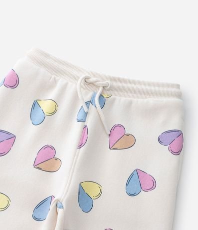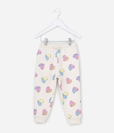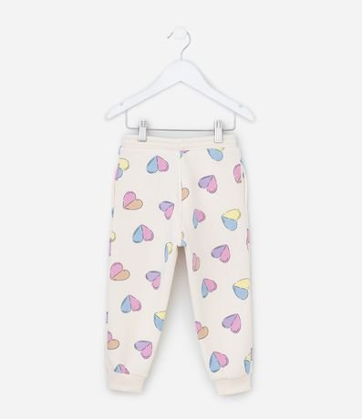 Calça infantil modelo jogger, confeccionada em moletom com felpa e cós elástico com cordão ajustável. Possui estampa fullprint de corações, punhos com elasticidade e toque interno macio que auxilia na manutenção do calor.